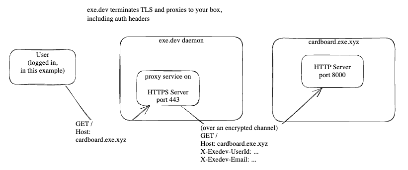 vmname.exe.xyzへのトラフィックを VM にプロキシしてくれる.TLS 証明書の発行・管理を自動でやってくれるので開発者はポートで待ち受けるだけ.デフォルトはプライベートで Email 認証したユーザだけがアクセスでき,公開したければコマンド一発もしくは Web コンソールで切り替えられる.自分のドメインを VM に向けることもでき,CNAME レコードを設定するだけで、TLS 証明書も自動発行. - Login with exe: exe.dev の認証システムを自分のアプリでも使える.認証されたユーザーには